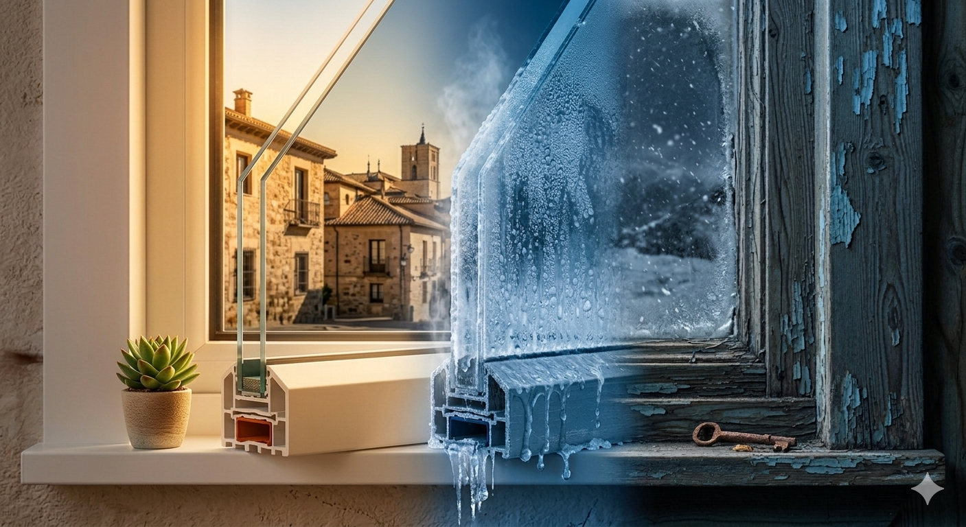 Las ventanas antiguas de vidrio simple o los marcos deteriorados pueden triplicar las pérdidas de calor respecto a una ventana moderna de PVC con doble acristalamiento y rotura de puente térmico.